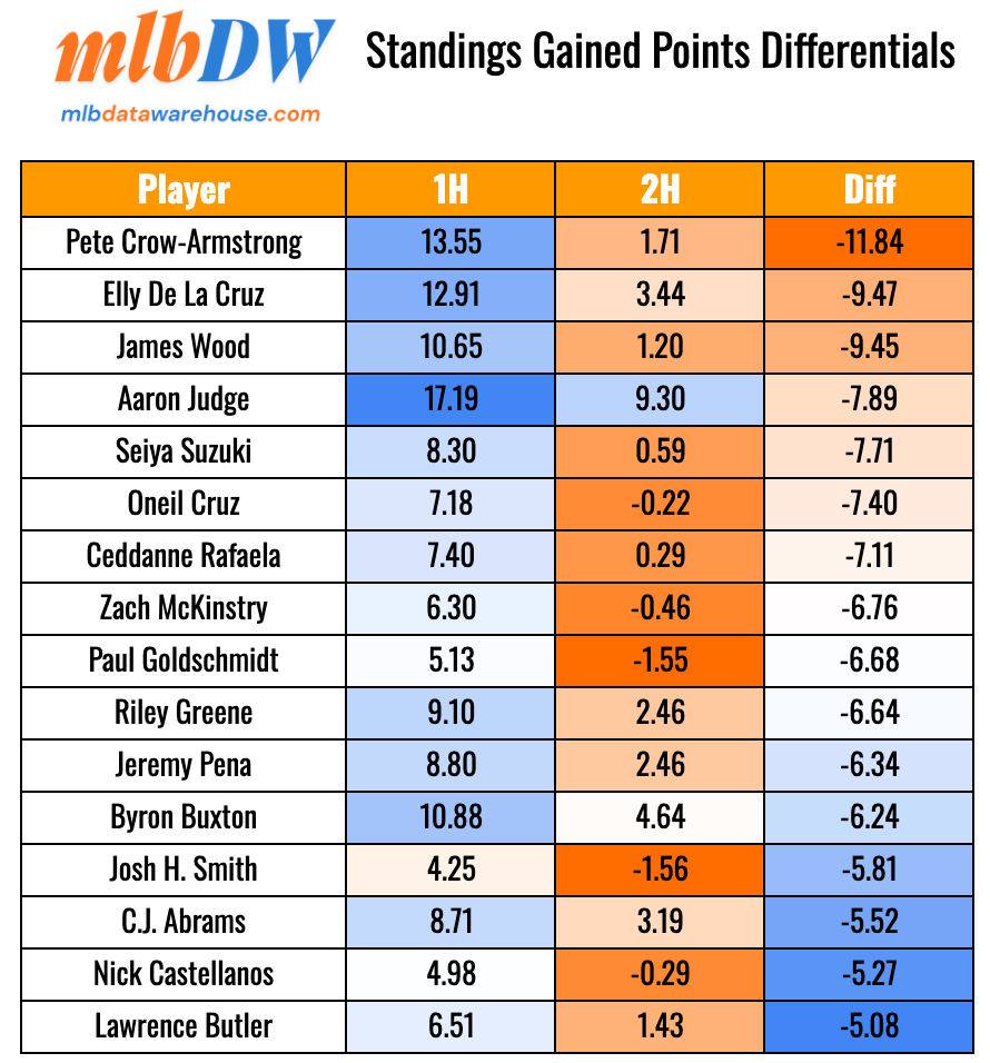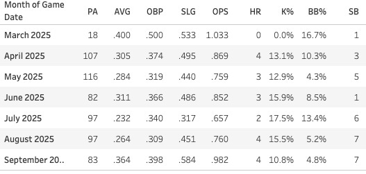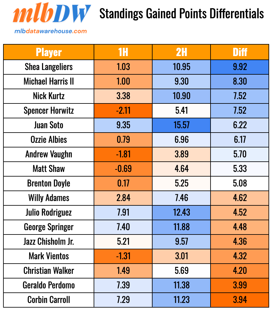 Matt Shaw: The classic case of a rookie who is overmatched in his first look at big league pitching but makes adjustments and improves. Shaw hit five homers in August. 11 of his 13 homers were in his final 220 PAs. His EV90 was 101.0 in the first half and 102.8 after the trade deadline. That’s the kind of in-season gain you don’t see very often. Add on the fact that he swiped 17 bags in 126 games played, and you have a guy who will likely project for a close to 20-20 season next year at the age of 24.