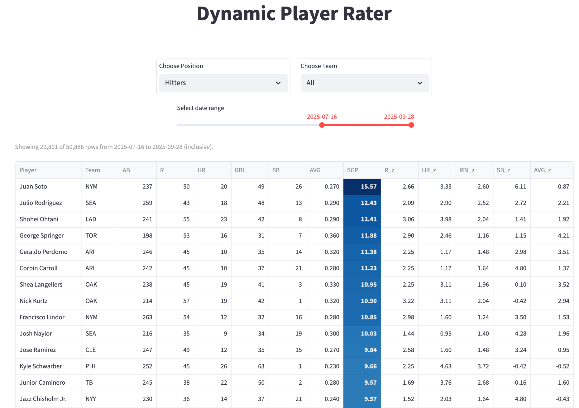 The other huge development that happened in 2025 was my learning how to create Python Streamlit Apps. I found out that these existed in March, and I’ve been learning and improving ever since. So the future of MLB DW is bright. I have user-friendly, interactive Python apps now. Tons of them! I’ve been piling everything into that. And that’s where I’ll host the offseason content (rankings, tools, projections, customizable league settings stuff, etc.).