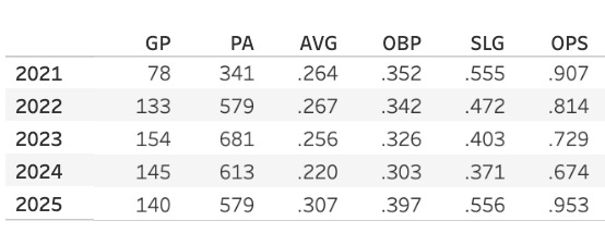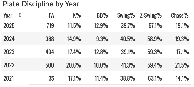 I have thought about writing down the Ten Commandments of MLB Data Warehouse. I haven’t done it. But if I ever do, one of them will be thou shalt not considereth the smaller sample size when a bigger one is present-eth. And that is exactly what you’re doing when you start drafting guys based on what they did in the final two or three months. James Wood still slugged .475 in 2025 with 31 homers. That’s a huge season. And you can get some value on it at times.