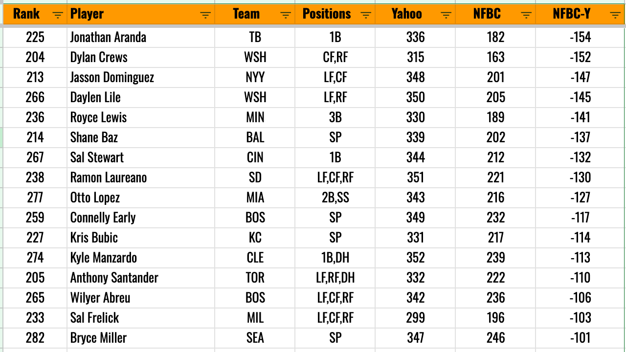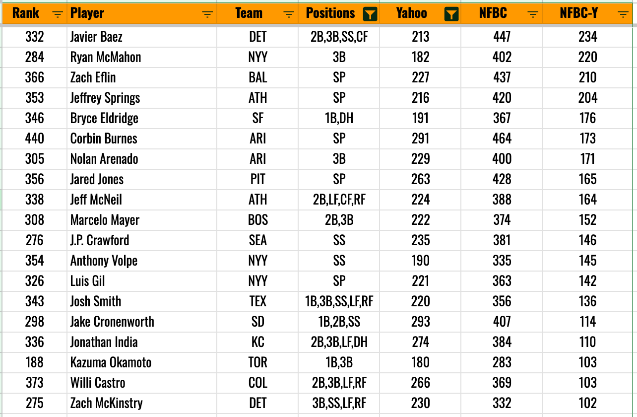 Even if you don’t love those guys, if NFBC dudes are picking them 100 picks earlier than Yahoo bros, you know you have something there. And you can absolutely exploit that, although obviously you need to take into account league settings - because NFBC does operate a lot differently than your standard sort of home league setup.