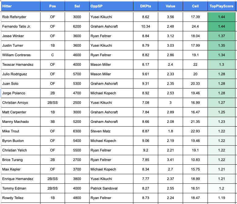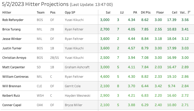 Here are the top 20 from the Top Plays sheet right now from the hitter projections sheet (paid subs have access to that):