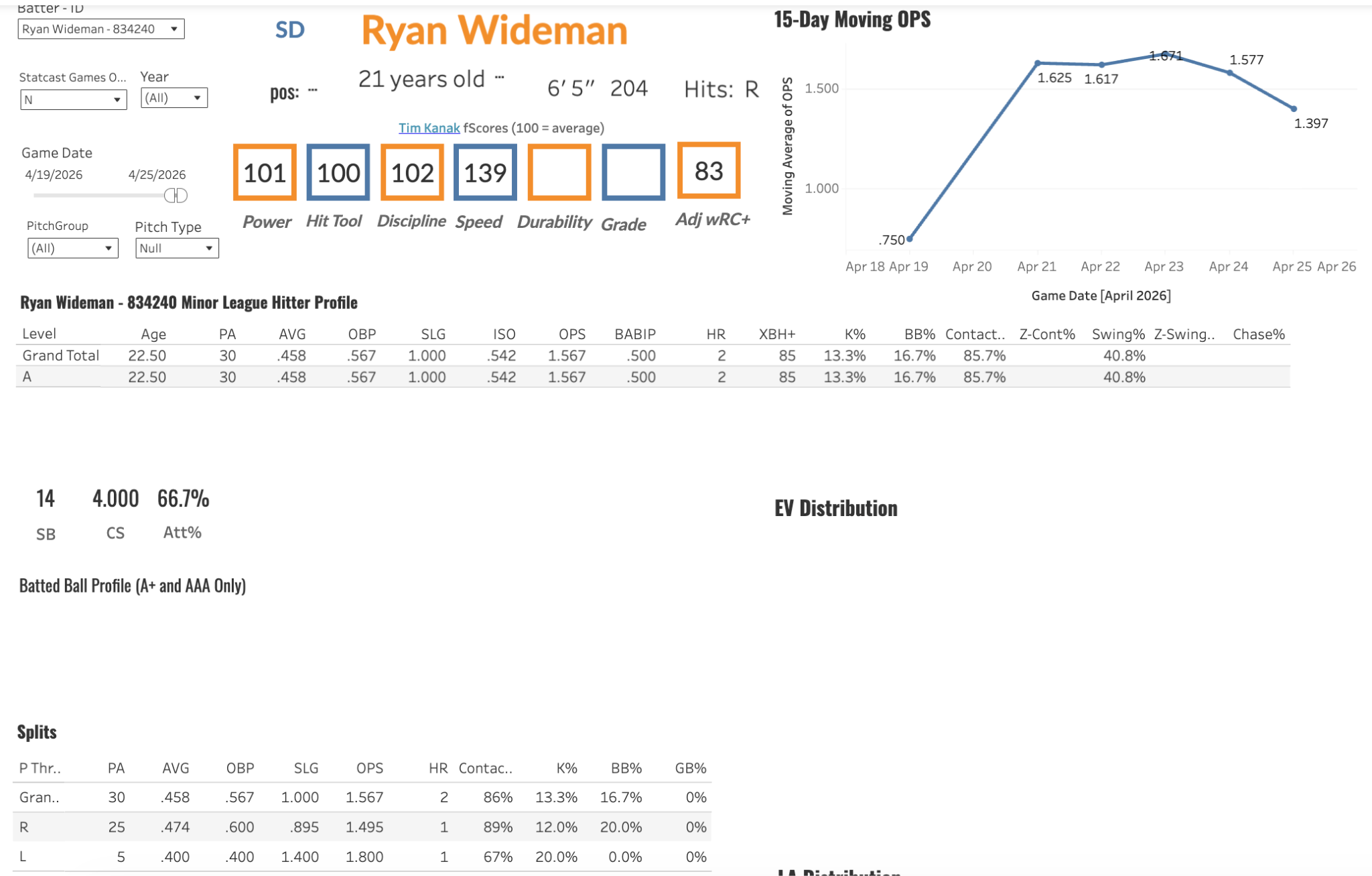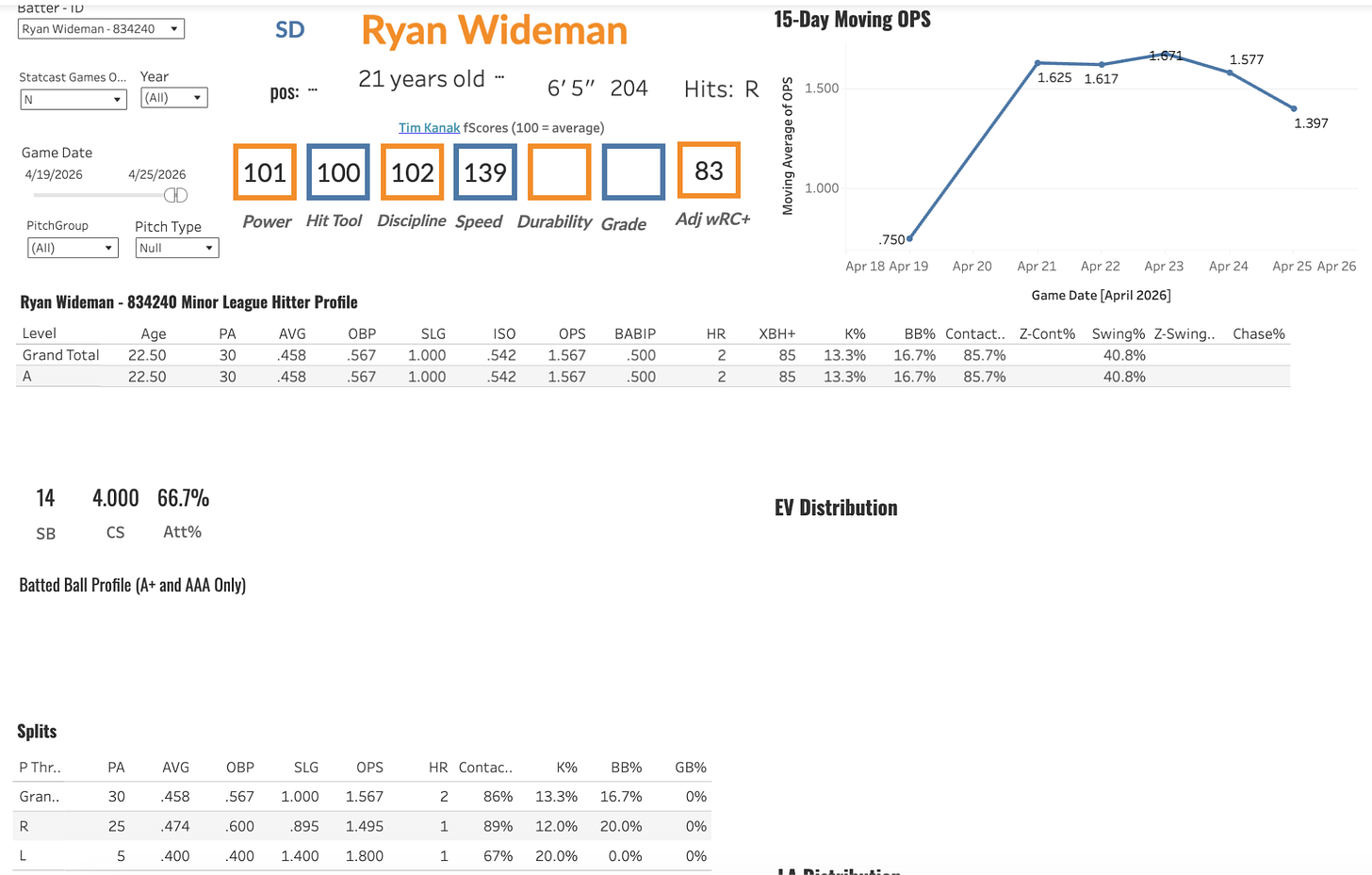 Prime Skills: Wideman is a dude I had a ton of interest in post-draft as a third rounder who played one year of division one ball for Western Kentucky and completely balled out; hitting .398/.466/.652 with 10 bombs and 45 steals from a 6’4, 205 pound frame. The hit was off last year in his small sample debut, but he did have 11 steals in 26 games. He also has some insane raw power we haven’t seen demonstrated yet with over 110 mph exit velocities with a wood bat at the combine and hitting to 92nd percentile EVs in college with metal bats last year. The 80% contact rates early season along with a solid plate approach led to a week where he hit 8 extra base hits, 2 bombs and had 6 steals and a .458 batting average.