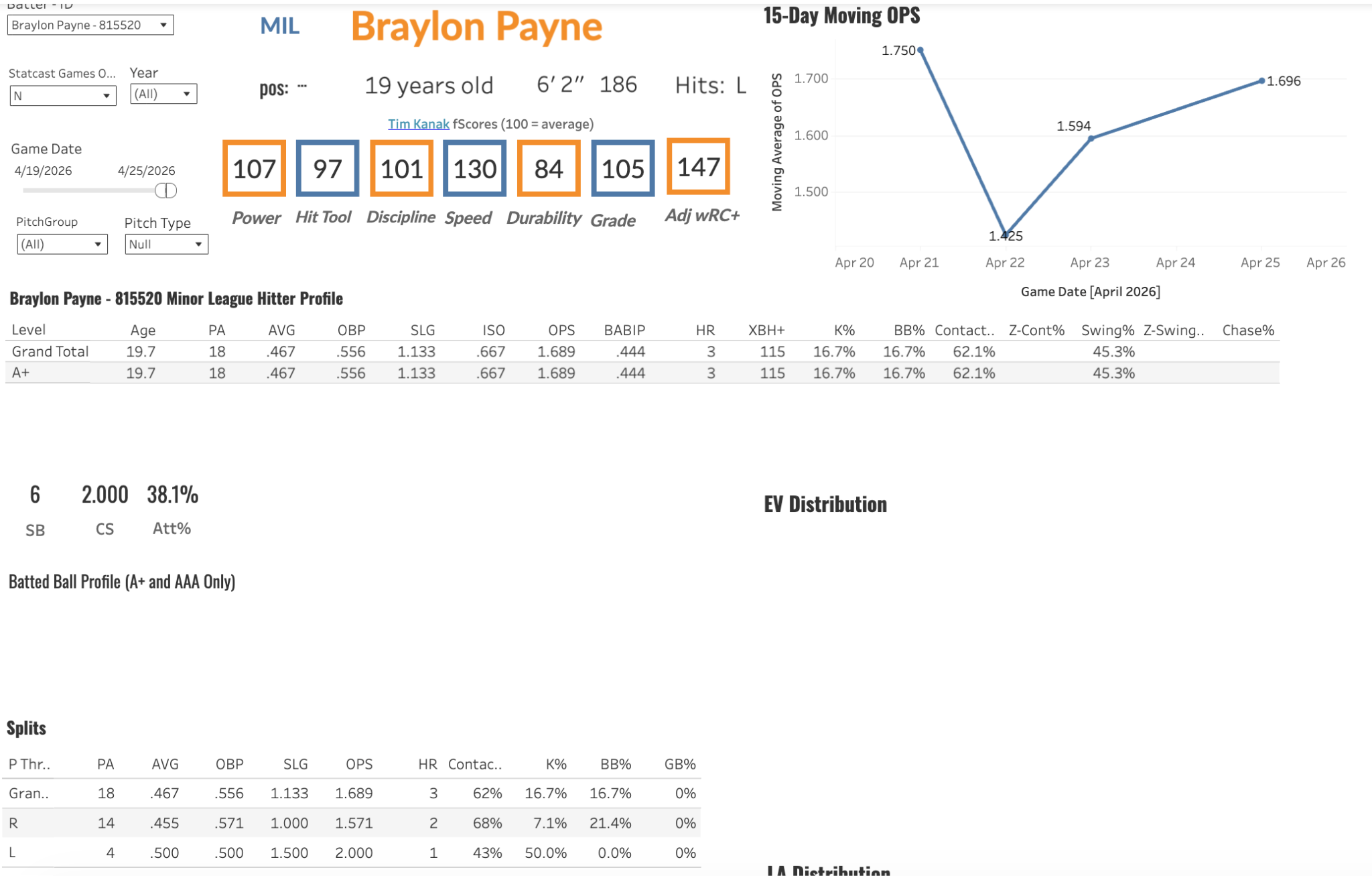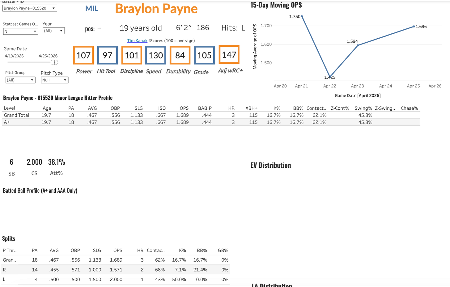 Prime Skills: Payne is a big bodied outfielder who is tooled up with a killer power and speed combo from the left side. He’s one of the faster guys picked in the 2024 draft and if he can develop the hit tools and classic Brewers plate skills, the tools can really play this kid up with some of the better Brewers prospects. Payne’s hit tool has regressed both contact and angles-wise from last year’s small sample size, but the plate skills are potentially above average to plus. Payne had a 110.2 max EV last season at 18-years-old and could grow into plus power if he improves his angles. He’s electric, speed-wise but could work on his base running ability. Payne was terrible in the second half last year, but has seemingly gotten over it with a stellar start to the season hitting 3 bombs with 4 extra base hits and two steals this week. The plate approach is looking much better early this season, however the contact rates are still off. I bumped his plate approach and power ratings from 40 to 45 based on the early season success.