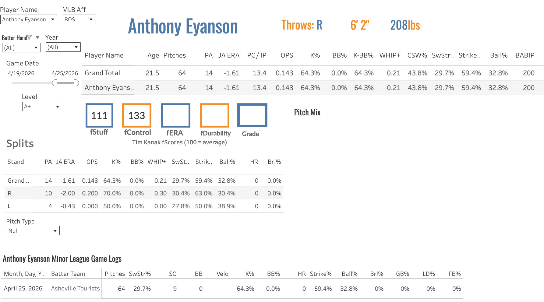 Prime Skills: Eyanson did get paid nicely for a third rounder out of LSU getting drafted for his elite command and wide pitching arsenal and then broke out this Spring with a huge velocity increase from sitting 93 in college to 95-98. He’s been dealing all year and should be bumped to AA at this point as he has 27 strikeouts and 0 walks in 16 2/3 innings this year. He will be a huge mover in my rankings update. This weekend he was pulled from a perfect game he was throwing with through 4 ⅔ with 9 strikeouts. I can’t wait to get pitch movement data from him, but the fastball went from a below average to average pitch to above average hitting over 16” of induced vertical break at plus velocity and the gyro slider is a sick bridge between the fastball and curve that gets the majority of his swing and miss. The curve is a 12/6, like the slider, so there is a little too much up and down vertical plane here and the development of a sweeper or traditional cutter could help him against righties and while he has been working on a splitter it hasn’t been used much in game action to this point. Once he moves up levels the development of a fourth and fifth pitch will be critical to avoid the Jonah Tong vertical plane trap.