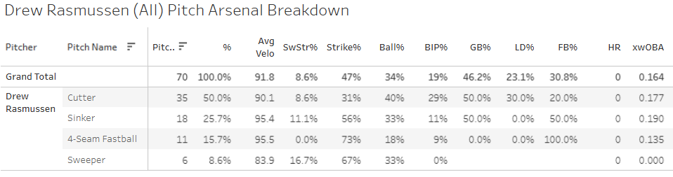 The pitch mix is unique. He mostly throws fastballs, but he has those three different variations. This is what he was doing last year from the bullpen as well when he posted a 15% SwStr% and a 32% Ball%. He was throwing harder then (97.4mph on the fours-eamer, that was down to 95.5 last night). It is possible that his K% won’t be great because of all of this. You don’t see a lot of high strikeout rates from guys throwing a ton of four-seamers, sinkers, and cutters. But I still think you start Rasmussen while he’s healthy, obviously. I’m pretty invested in the guy. I guess that means I won’t be the most fair judge of him, but whatever this is my freaking blog I can do what I want.