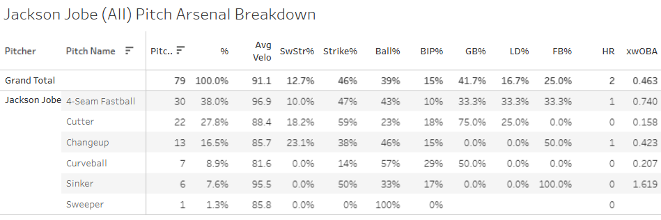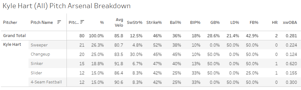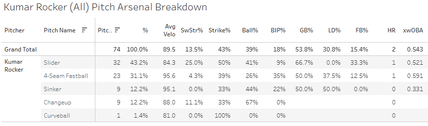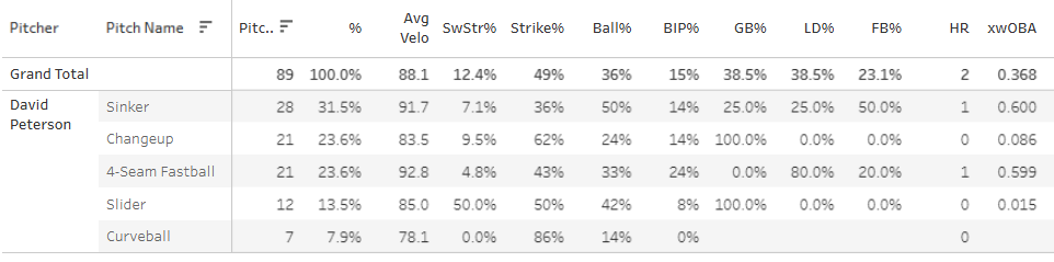 The slider put up an elite 25% SwStr%, but that’s the end of the good news, because it got taken out of the ballpark and hit hard other times, piling up a .521 xwOBA against it. The four-seamer was awful with a 4.3% SwStr% and the .591 xwOBA. He got pounded.