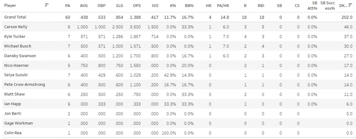 Things were so bad for the Athletics that Colin Rea got a plate appearance. Kyle Tucker is off to a bang-up start to his Cubs career. He has hit three homers already with a .323/.400/.742 slash line.