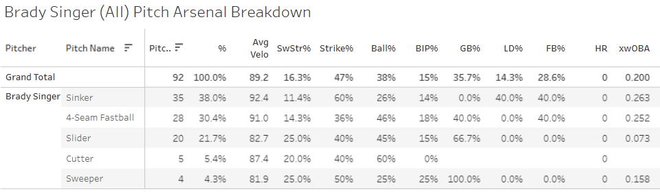 He went fastball crazy. That is not generally a recipe for getting more whiffs. The whiffs typically come on the slider, but it worked out for him yesterday. It is interesting to see him using more four-seamers. If he can pair those two together with about even usage and tunnel them well, he could add some strikeouts with deception. But I don’t know. I don’t want to get too far into the weeds here, I’m not adding Singer right now.