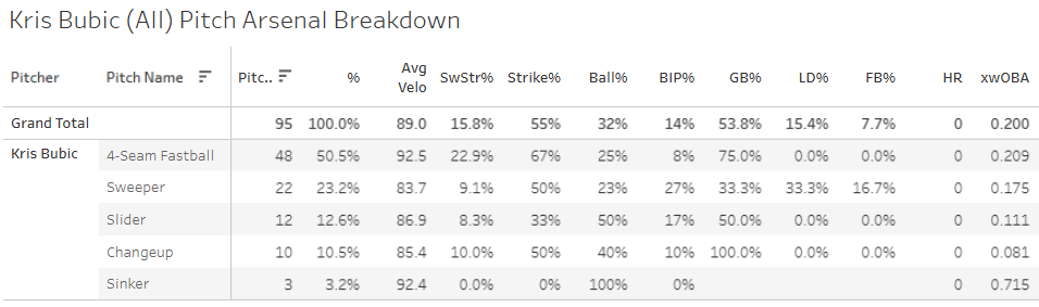 But anyways, Bubic located the four-seamer very well (25% Ball%, 67% Strike%), and got a ton of whiffs on it as well at a 23% SwStr%. The sweeper was also in the zone a bunch, and hitters just couldn’t do anything with any of his pitches.