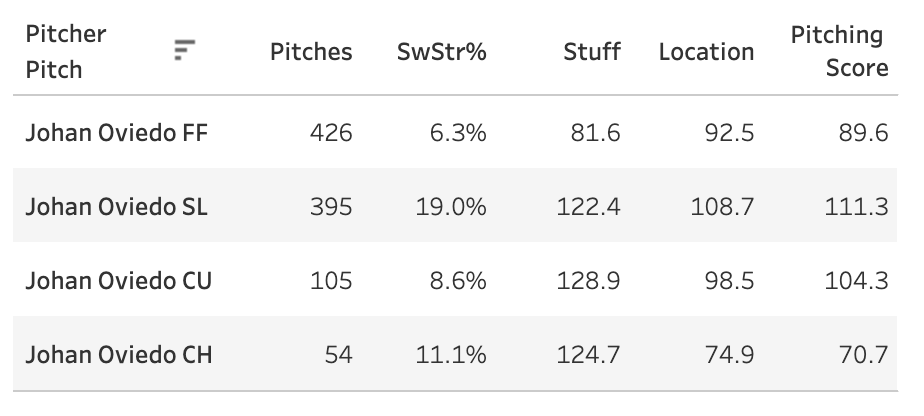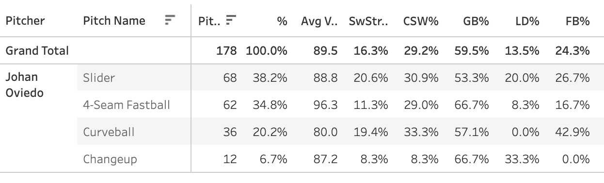 He does seem to have a good slider (19% SwStr%, 56% GB% last year), and the fastball has plenty of velocity - so it’s a good base. I’ll be keeping an eye on Oviedo moving forward, even though that will be tougher for me now since I’m no longer a Pirate fan after the Oneil Cruz injury.