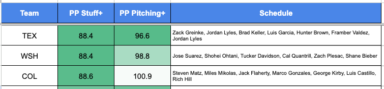 What you find is that guys like Yusei Kikuchi have high Stuff+ ratings, but it’s not like he’s a guy you don’t want to have hitters against. If you’re looking at it, just keep an eye on the schedule column to see which pitchers are there.