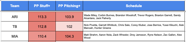 There is still this issue we have with Stuff+ not always meaning the pitcher is great, so I don’t know if this is really the perfect way to do the schedule analysis - but it is interesting to see if nothing else. Here’s a preview: