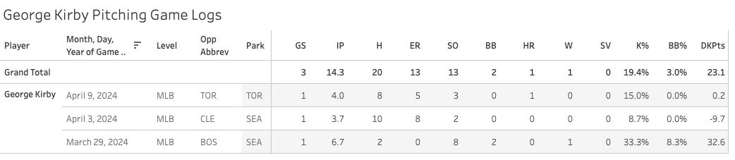 Anyways, I wouldn’t worry about Kirby, but there is a lesson here about drafting a low strikeout pitcher as your SP1. They are more susceptible to these kinds of “BABIP outings” where they just get dinked and dunked to death. That isn’t going to happen to Tyler Glasnow very much because he’s just not allowing many balls in play, and Kirby is much more dependent on his fielders making outs for him.