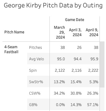 It looks either like my tracker is busted, or Kirby really toned down the velo after his first ten fastballs, because the average velo ended at 95.9 on the pitch yesterday. That’s above the season average for sure, but not dramatically so: