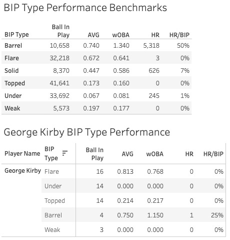 Here’s the ball in play details using the Statcast algorithm (“Pitcher BIP Analysis” tab on the dashboard):