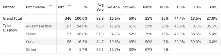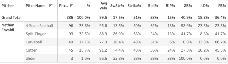 The 17.5% SwStr% is pretty surprising, the four-seamer and splitter have really been good: