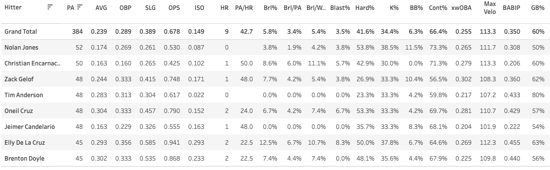 Only eight hitters have a K% above 30% and a GB% above 50%. That’s a really, really bad combination of stats. Elly has a 38% K% and a 63% GB%. If you just told me those two numbers, I would assume the dude is hitting like .210. But no, he’s slashing .293/.356/.585. He’s homered twice, but one was an inside-the-park job, and the Brl% isn’t even good at 12.5% (this would be good with a lower K%, but with that many strikeouts it’s not a good numbers).