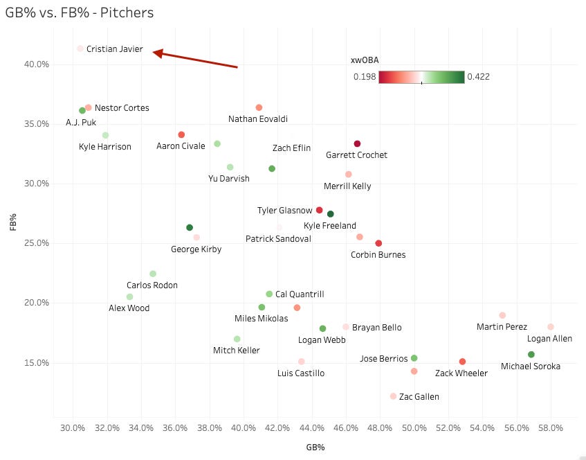 Goofy start to the year for Javier. The K-BB% is legitimately awful at 19%-13%, but he’s allowed just two earned runs in 16.2 innings. He has not given up a home run yet, and going back to last year that’s six straight [regular season] starts without giving up a dinger. But he gave up 25 homers in 31 starts last season overall, and he’s been one of the highest FB% pitchers in the league since he came up.