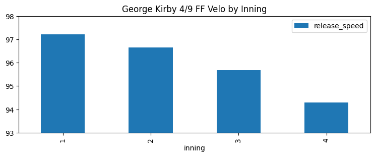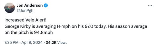 Good news, my tracker was not busted. Kirby indeed came out ripping but then really calmed it down after the first couple of innings:
