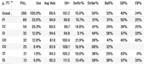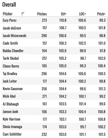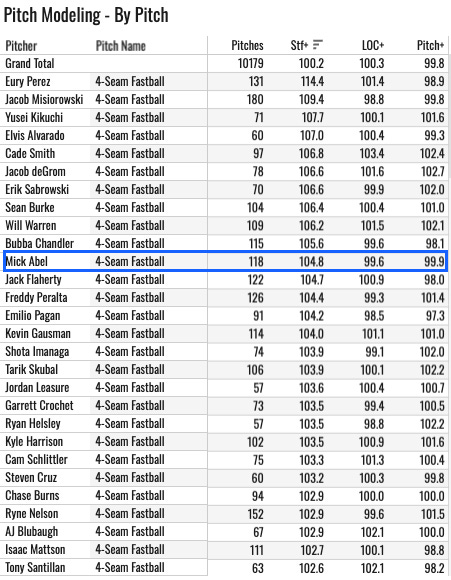 He has a top ten four-seamer among SPs by this measure. If you combine all of his pitches and do Stuff+ overall, he’s still in the top 15: