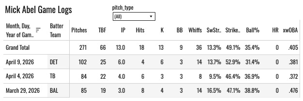 7. Mick Abel: 102 Pitches, 18 Outs, 5.67 POUT