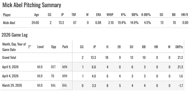 2. Mick Abel (MIN): 14 Whiffs (102 Pitches)