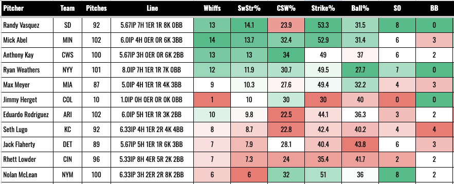 5. Randy Vasquez (SD): 13 Whiffs (92 Pitches)