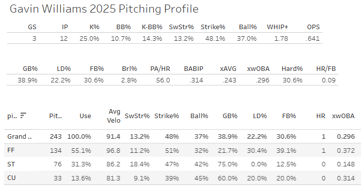 All things taken together, Williams has passable numbers. None of this screams “send this guy back to the minors”. The .296 xwOBA against is nice, and that’s probably the most important thing as far as staying in the rotation goes. If you’re keeping an xwOBA under 0.3, you’ll be fine.