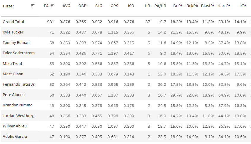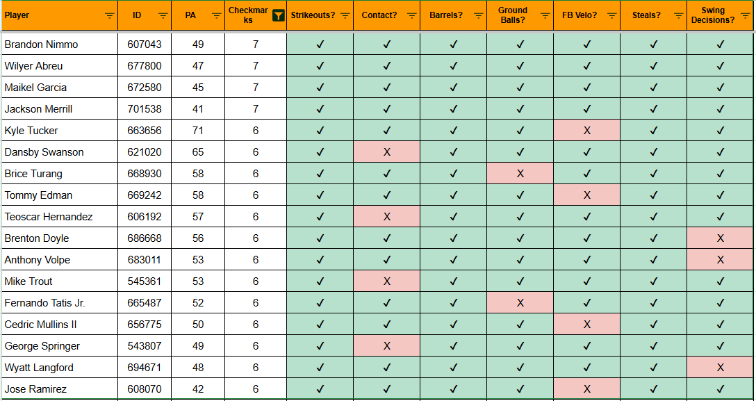 Again, not a ton of surprises. But maybe good signs for Adolis Garcia, Jordan Westburg (although he’s been banged up recently), Brandon Nimmo (again), Tyler Soderstrom, and Wilyer Abreu.