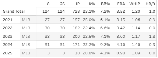 That ball rate still cost him a quality start. It took him 94 pitches to get through five. He now has a 13.2% SwStr% (decent) and a 37% Ball%. Those are numbers you can hang around with, but they aren’t going to put you in “very useful fantasy pitcher” territory.