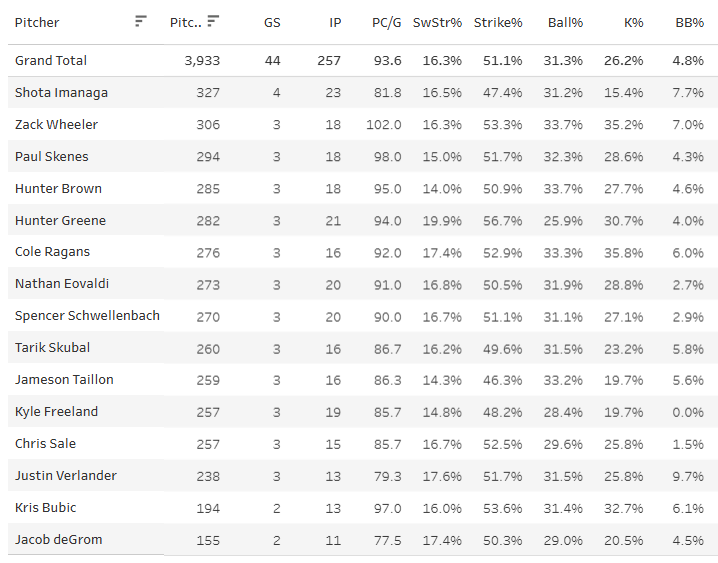 The longer I do this stuff, the more I find myself just focusing on those marks. SwStr% and Ball%. Part of that is because it’s kind of my own idea. I really don’t like taking other people’s ideas. I want to do my own thing. But I also do think it’s a very effective way to judge pitchers. We want strikeouts and we don’t want walks. These two stats are great predictors of those things, and they stabilize more quickly. Early in the season, it makes a ton of sense to focus on those two.