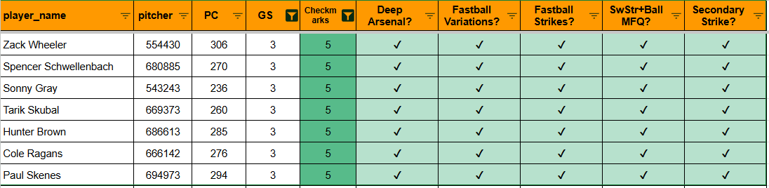 Let’s check on some checkmarks before moving on. Here are your 5+ check SPs (two start minimum):