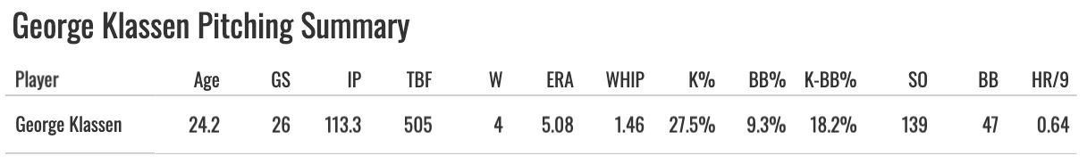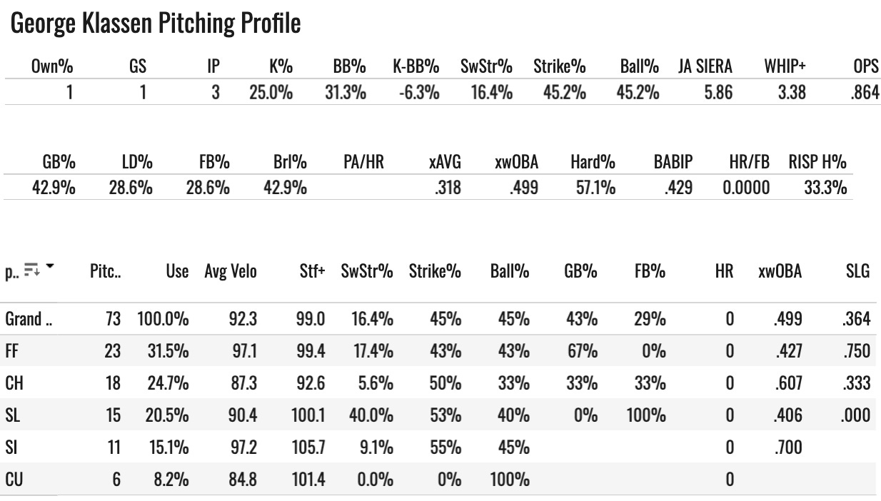 I checked Pitch Profiler, and that model doesn’t even like his fastball (98 proStuff+). It’s got plenty of velo (97.1), but it doesn’t have a very good movement profile, at least from that modeling perspective. So I probably wouldn’t want Klassen in fantasy leagues if I had to make a decision today.