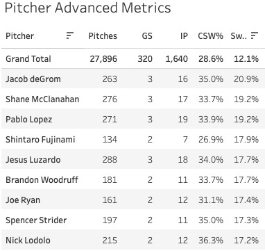 A 19.2% SwStr% sheesh! That ties him with McClanahan for second (behind, you guessed it - deGrom) for highest SwStr% among pitchers who have made at least two starts. Here’s the 17%+ club:
