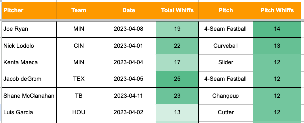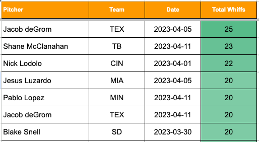 Checking in on the whiffs leaderboard, a Google Sheet that updates daily that gives you the whiff counts by start and by pitch count (two tabs now, check it out if you’re a paid sub!)