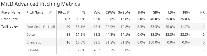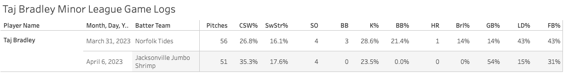 I had finished the post, but I’m now #circling #back to mention that the Rays have called up Taj Bradley to replace Zach Eflin in the rotation as he heads to the IL. This gives us a good chance to look into the MiLB Statcast dashboard to see what we’re working with. Unfortunately, it’s still very early in the season so we don’t have a ton of data - but it’s so dope to have this AAA data available now that I’m doing it anyways.