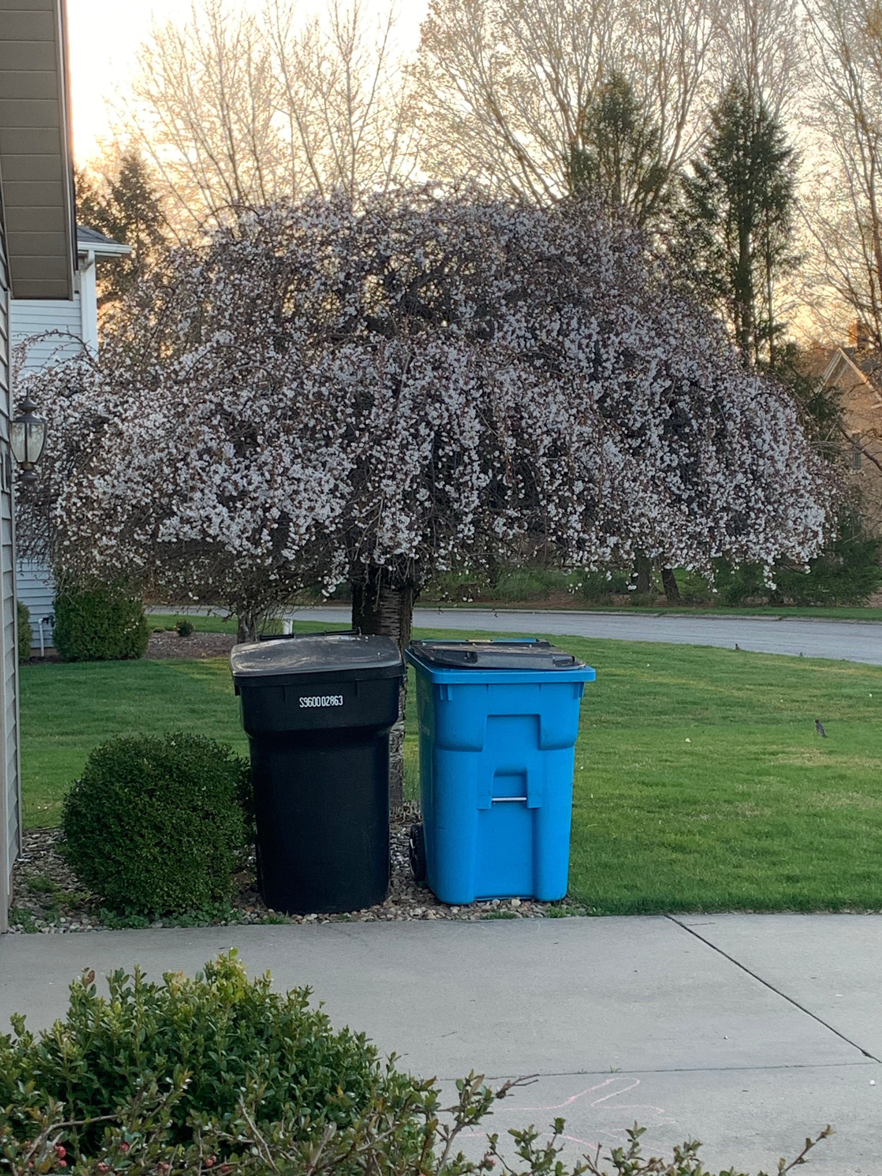I took that picture this morning. If I were a true artist, I might have moved the garbage cans. Unfortunately, Producer Lee and I live 360 miles away so he couldn’t get out here in time to prepare the set.