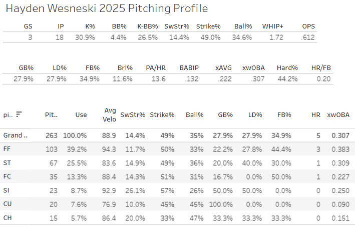 The good news is the 14.4% SwStr%, the non-awful 35% Ball%, and the depth of the pitch mix. He’s throwing six pitches, although two of those make up 65% of the mix. The fastball has never been anything special, but it’s working early on. The breaking stuff is what always had people excited about Wesneski, and you can see that the very strong marks on the sweeper and cutter.