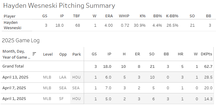 6. Hayden Wesneski (vs. LAA): 28.5 Points