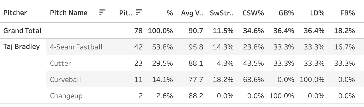 8. Taj Bradley (TB): 11.5 SwStr%, 34.6 CSW%