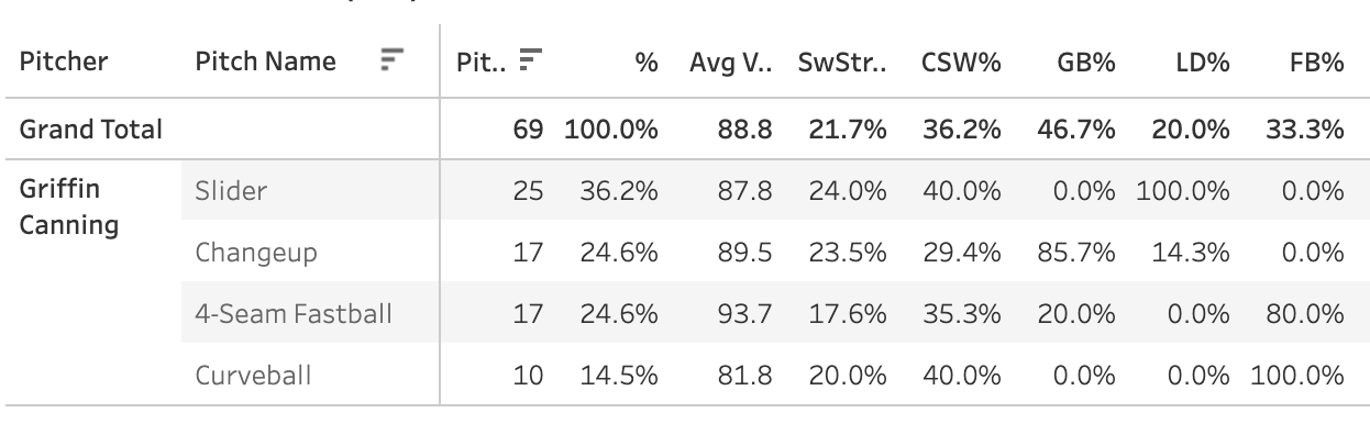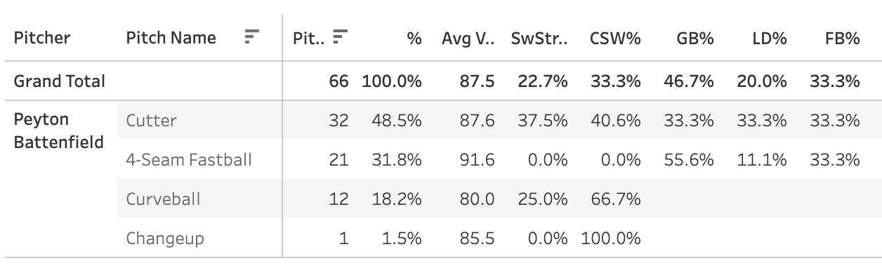 Peyton Battenfield, on the other hand, had a 23.5% SwStr%! Griffin Canning had a mark of 21.7%! Remember Griffin Canning? Guy was a legit pitching prospect back in 2019 but has struggled in the Majors in a short sample and missed all of last year recovering from TJ. Keep an eye on that man!