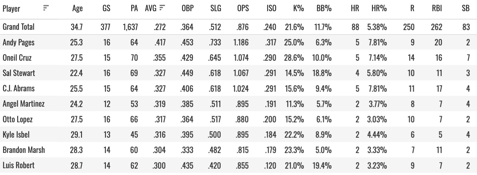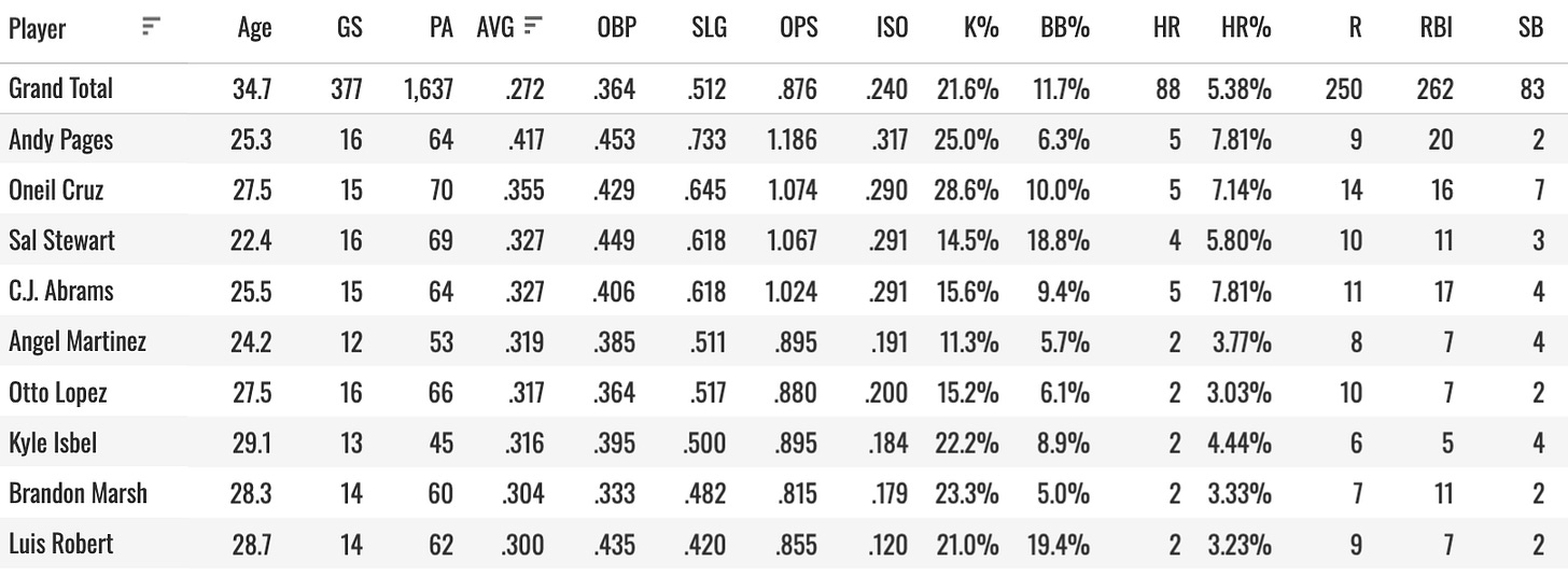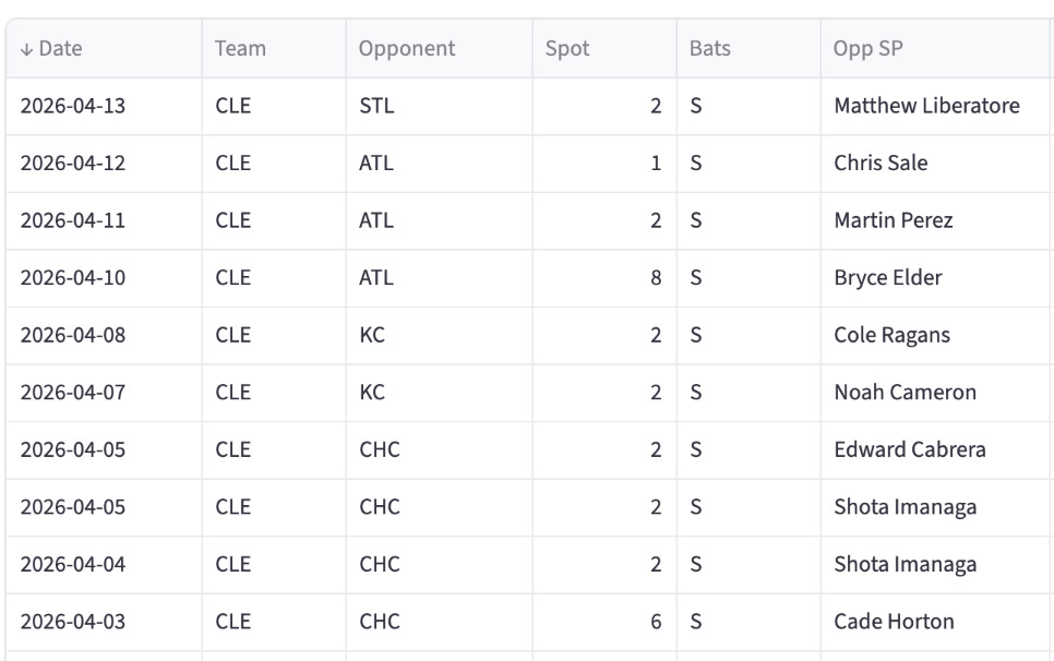 And here we arrive at Angel Martinez, who I wanted to talk about specifically. And that’s kinda why I did this. He’s a 2B/OF eligible player on most sites. He’s been hitting well and has ended up at the top of the Guardians lineup recently.