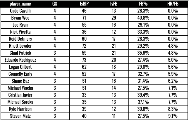 That’s 29 fly balls for Bryan Woo without a homer. And 16 for Joe Ryan, and 17 for Reid Detmers! Beware the long ball in those cases.