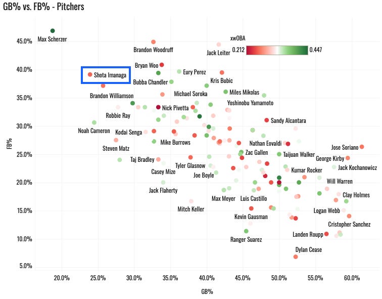 The one thing to mention, as always with Imanaga, is the fly ball rate. A 24% GB% is laughably low. The guy has the second-lowest GB% among starters in the league, only Max Scherzer is lower.