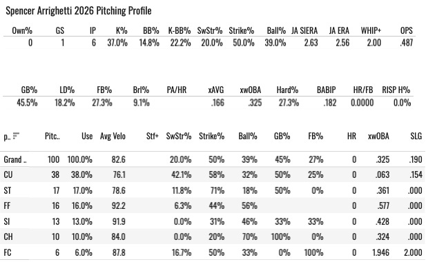 There’s always been a walk problem. And pairing that with a probably bad fastball seems very risky. I wouldn’t be too excited about Arrighetti, but it’s also not very easy to get 20 whiffs in any given situation.