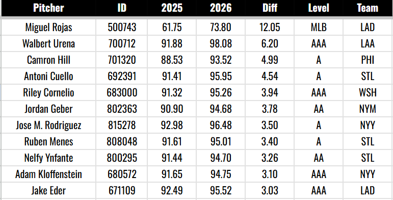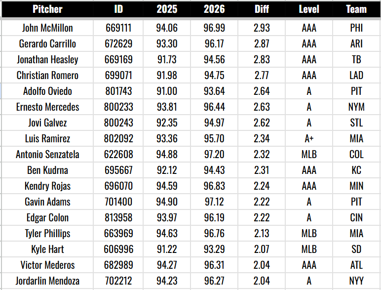 There are 11 pitchers who have kicked up the four-seamer by at least three miles per hour this year, compared to 2025: