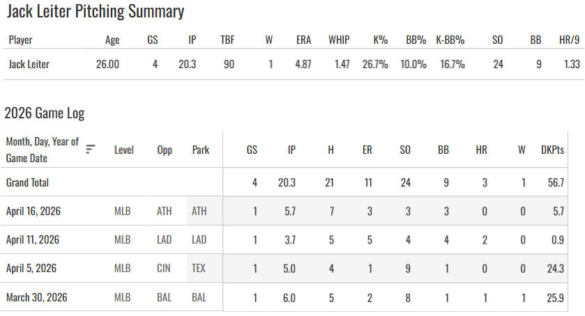 Let’s check back on Jack Leiter. Suddenly his ERA is up to 4.87 and his K-BB% is down to 17%.