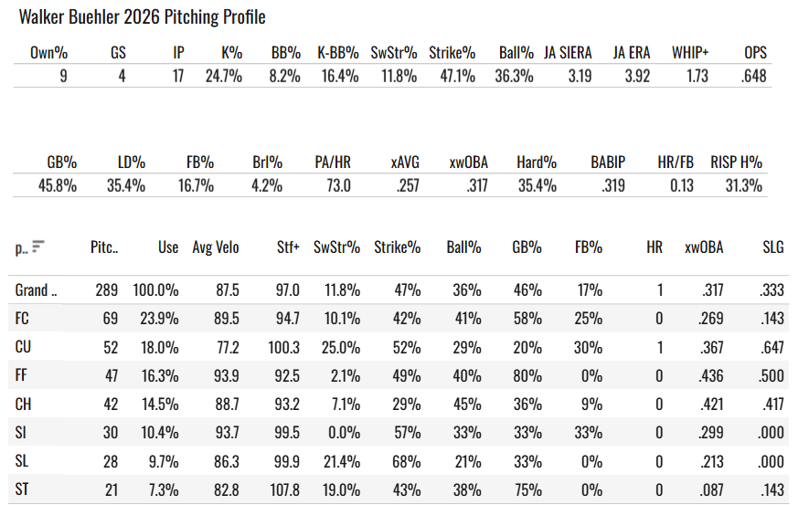 Let’s give a look to Walker Buehler. This guy was a non-roster invitee to spring, right? And now he’s made four starts for the Padres with a 4.58 ERA and a 1.25 WHIP. That ERA is bad, but the 24.7% K% and 8.2% BB% with 0.51 HR/9 is quite good.