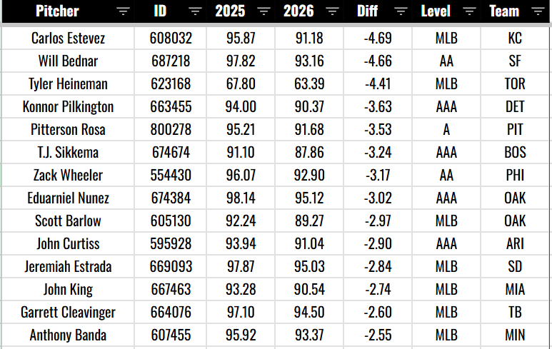 I checked four-seam fastball changes for all professional levels of baseball. This might help some of the dynasty people out.