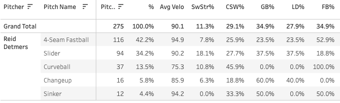 Reid Detmers pitched quite well again. Here is what his arsenal has looked like: